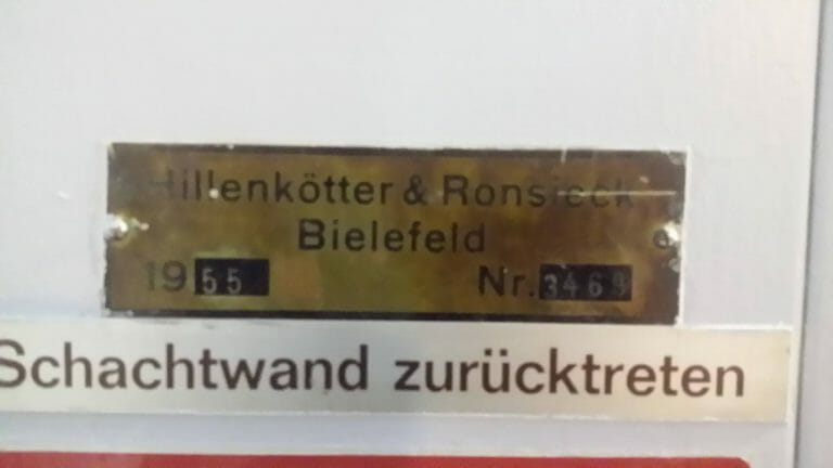 Einer unserer Monteure hat gerade ein besonderes Schätzchen aufgetan. In Arnsberg tut ein Aufzug seinen Dienst, der im nächsten Jahr 60. Jubiläum feiert. 1955 wurde das gute Stück gefertigt, installiert und in Betrieb genommen.